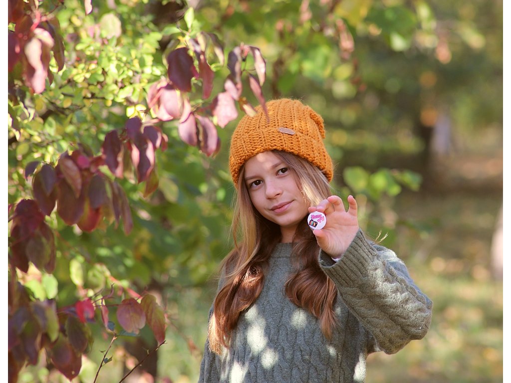 Na čepici je přišitý štítek "handmade" a součástí čepice je také odznáček, který lze z čepice sundat a můžete si ho připnout kamkoliv jinam - na bundu, mikinu nebo batůžek.